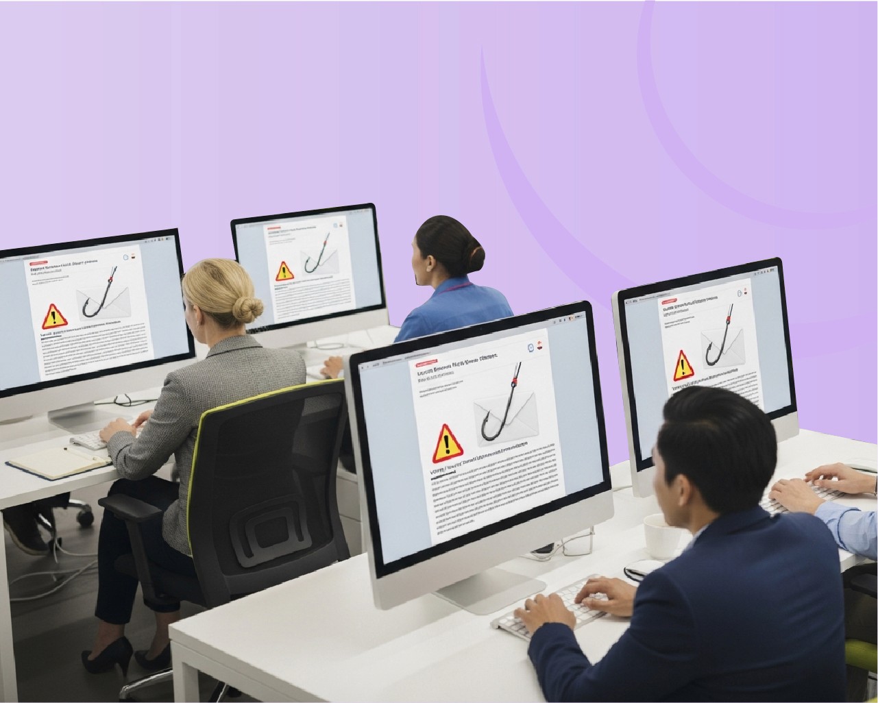 Employees interact with the simulation (click, ignore, report).